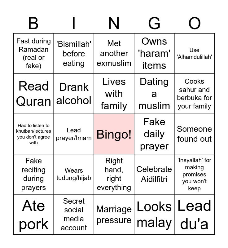 This bingo card has a free space and 24 words: Wears tudung/hijab, Secret social media account, Lives with family, Ate pork, Use 'Alhamdulillah', Fast during Ramadan (real or fake), Read Quran, 'Bismillah' before eating, Fake daily prayer, Right hand, right everything, Dating a muslim, Had to listen to khutbah/lectures you don't agree with, Celebrate Aidilfitri, 'Insyallah' for making promises you won't keep, Drank alcohol, Looks malay, Someone found out, Met another exmuslim, Cooks sahur and berbuka for your family, Lead prayer/Imam, Lead du'a, Fake reciting during prayers, Owns 'haram' items and Marriage pressure.