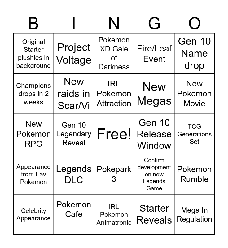 This bingo card has a free space and 24 words: Legends DLC, Pokemon Cafe, IRL Pokemon Attraction, Celebrity Appearance, Gen 10 Name drop, Original Starter plushies in background, Champions drops in 2 weeks, Project Voltage, Gen 10 Release Window, Pokepark 3, New Megas, New Pokemon RPG, Confirm development on new Legends Game, Pokemon Rumble, New raids in Scar/Vi, Starter Reveals, TCG Generations Set, Pokemon XD Gale of Darkness, New Pokemon Movie, Gen 10 Legendary Reveal, Mega In Regulation, Appearance from Fav Pokemon, Fire/Leaf Event and IRL Pokemon Animatronic.