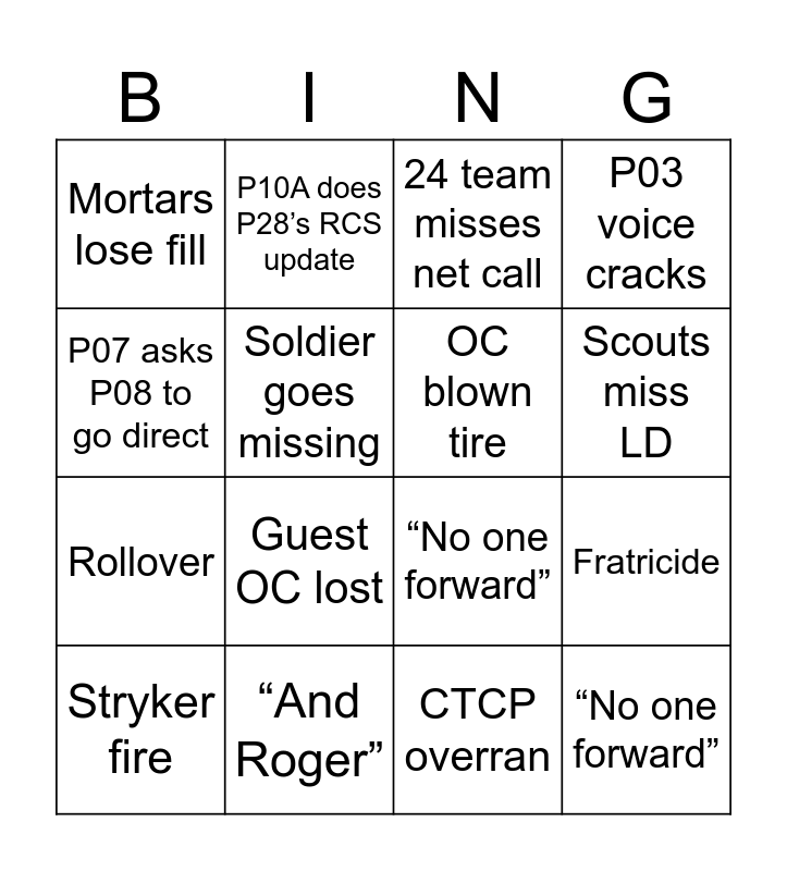 This bingo card has 17 words: Stryker fire, “And Roger”, 24 team misses net call, P03 voice cracks, Rollover, Soldier goes missing, “No one forward”, Scouts miss LD, P07 asks P08 to go direct, Guest OC lost, CTCP overran, Fratricide, Mortars lose fill, P10A does P28’s RCS update, OC blown tire, “No one forward” and 24 team misses net call P03 voice cracks Rollover Soldier goes missing “Noone forward” Scout LD P07 asks P08 to go direct Guest OC lost CTCP overran Fratricide Mortars lose fill P10A does P28’s RCS update OC b.