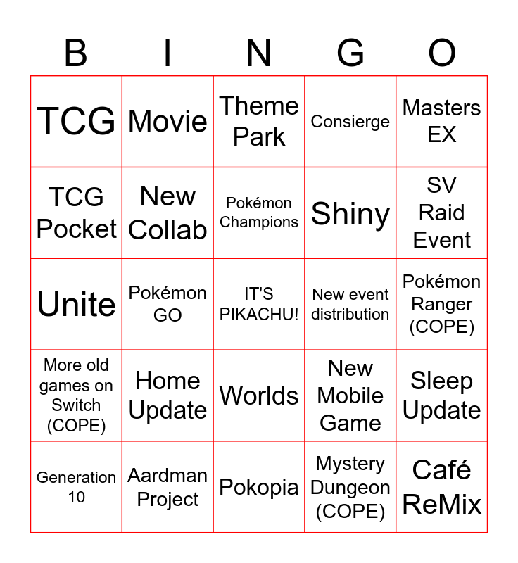 This bingo card has a free space and 24 words: Home Update, Aardman Project, Pokémon Champions, Generation 10, Masters EX, TCG, TCG Pocket, Movie, New event distribution, Worlds, Shiny, Unite, New Mobile Game, Sleep Update, New Collab, Mystery Dungeon (COPE), Pokémon Ranger (COPE), Theme Park, SV Raid Event, Pokémon GO, Café ReMix, More old games on Switch (COPE), Consierge and Pokopia.