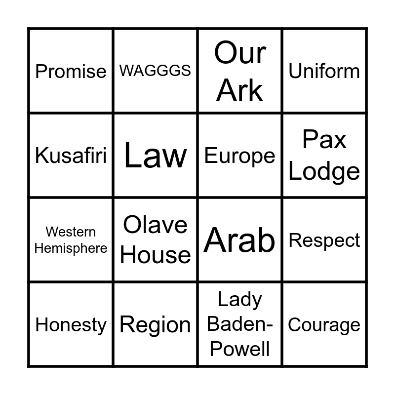 This bingo card has 24 words: Sangam, Our Chalet, Pax Lodge, Our Cabana, Kusafiri, Promise, Law, WAGGGS, Region, World Centre, Western Hemisphere, Arab, Asia Pacific, Africa, Europe, Trefoil, Lady Baden-Powell, Our Ark, Olave House, Respect, Honesty, Courage, Uniform and History.