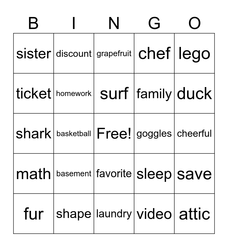 This bingo card has a free space and 52 words: grade, attic, garage, laundry, basement, movie, discount, action, ticket, breakfast, homework, stretch, save, sleep, healthy, weekend, surf, goggles, instrument, lego, basketball, video, sister, family, friend, park, mall, zoo, duck, interest, elementary, chef, artist, gamer, bitter, grapefruit, shape, dessert, round, sweet, creative, cheerful, math, subject, favorite, wear, mammal, shark, bird, hunt, fur and stripes.