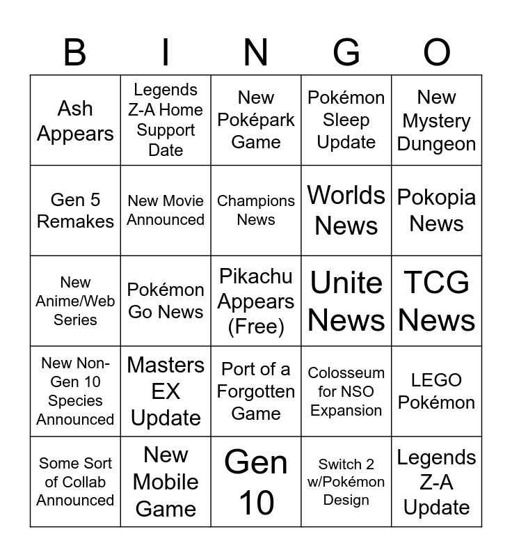 This bingo card has a free space and 24 words: Masters EX Update, New Mobile Game, Champions News, Some Sort of Collab Announced, New Mystery Dungeon, Ash Appears, Gen 5 Remakes, Legends Z-A Home Support Date, Unite News, Port of a Forgotten Game, Worlds News, New Anime/Web Series, Colosseum for NSO Expansion, LEGO Pokémon, New Movie Announced, Switch 2 w/Pokémon Design, TCG News, New Poképark Game, Pokopia News, Pokémon Go News, Legends Z-A Update, New Non-Gen 10 Species Announced, Pokémon Sleep Update and Gen 10.