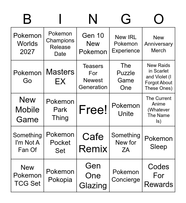 This bingo card has a free space and 24 words: Pokemon Pocket Set, Pokemon Pokopia, Teasers For Newest Generation, New Pokemon TCG Set, New Anniversary Merch, Pokemon Worlds 2027, Pokemon Go, Pokemon Champions Release Date, Pokemon Unite, Cafe Remix, The Puzzle Game One, New Mobile Game, Something New for ZA, Pokemon Sleep, Masters EX, Pokemon Concierge, The Current Anime (Whatever The Name Is), Gen 10 New Pokemon, New Raids in Scarlet and Violet (I Forgot About These Ones), Pokemon Park Thing, Codes For Rewards, Something I'm Not A Fan Of, New IRL Pokemon Experience and Gen One Glazing.