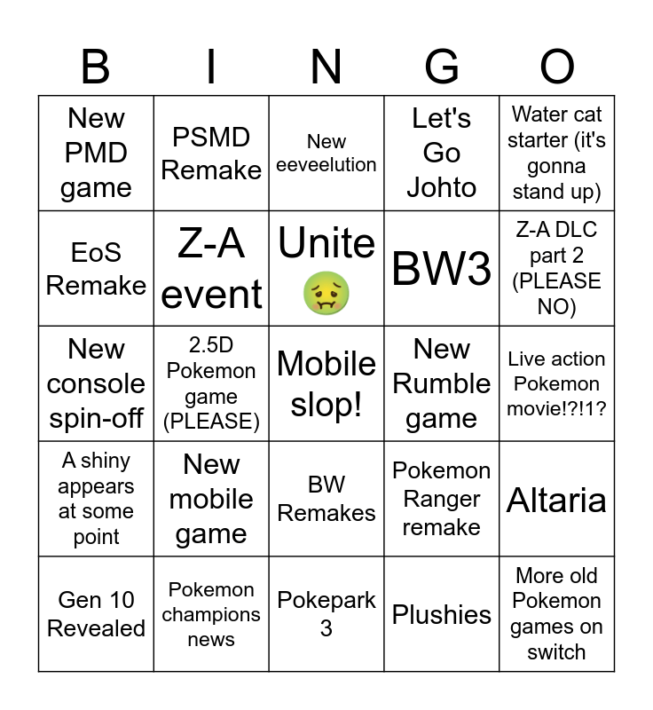 This bingo card has a free space and 24 words: New mobile game, Pokemon champions news, Unite 🤢, Gen 10 Revealed, Water cat starter (it's gonna stand up), New PMD game, EoS Remake, PSMD Remake, New Rumble game, BW Remakes, BW3, New console spin-off, Pokemon Ranger remake, Altaria, Z-A event, Plushies, Live action Pokemon movie!?!1?, New eeveelution, Z-A DLC part 2 (PLEASE NO), 2.5D Pokemon game (PLEASE), More old Pokemon games on switch, A shiny appears at some point, Let's Go Johto and Pokepark 3.