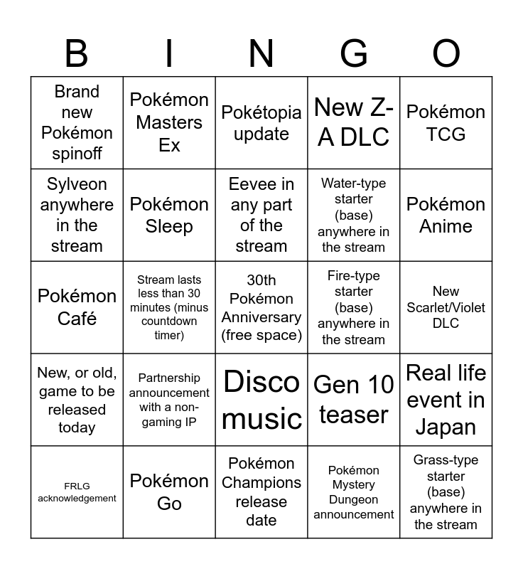 This bingo card has a free space and 24 words: Partnership announcement with a non-gaming IP, Pokémon Go, Eevee in any part of the stream, FRLG acknowledgement, Pokémon TCG, Brand new Pokémon spinoff, Sylveon anywhere in the stream, Pokémon Masters Ex, Fire-type starter (base) anywhere in the stream, Disco music, Water-type starter (base) anywhere in the stream, Pokémon Café, Gen 10 teaser, Real life event in Japan, Pokémon Sleep, Pokémon Mystery Dungeon announcement, New Scarlet/Violet DLC, Pokétopia update, Pokémon Anime, Stream lasts less than 30 minutes (minus countdown timer), Grass-type starter (base) anywhere in the stream, New, or old, game to be released today, New Z-A DLC and Pokémon Champions release date.