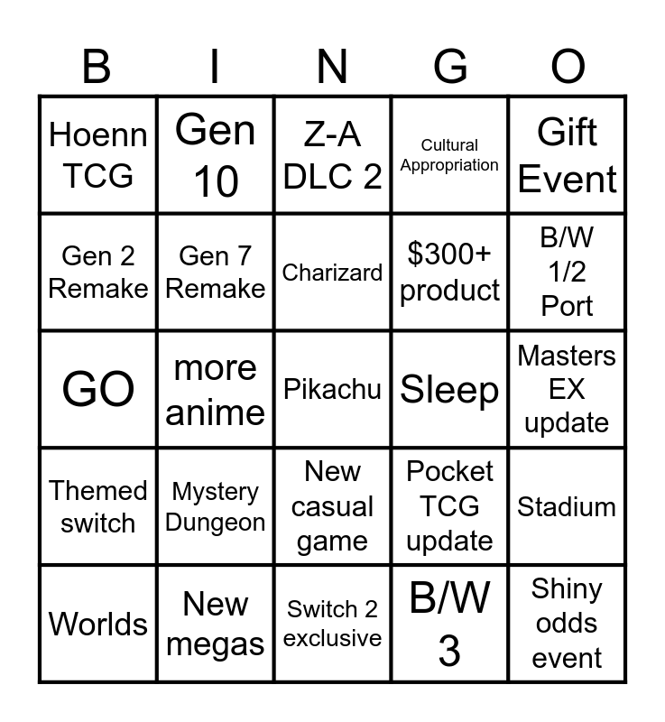 This bingo card has a free space and 24 words: Mystery Dungeon, New megas, Charizard, Worlds, Gift Event, Hoenn TCG, Gen 2 Remake, Gen 10, Sleep, New casual game, $300+ product, GO, Pocket TCG update, Stadium, Gen 7 Remake, B/W 3, Masters EX update, Z-A DLC 2, B/W 1/2 Port, more anime, Shiny odds event, Themed switch, Cultural Appropriation and Switch 2 exclusive.