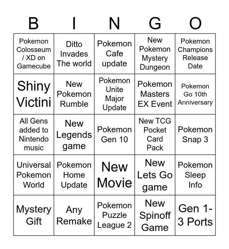 This bingo card has a free space and 24 words: Pokemon Home Update, Any Remake, Pokemon Unite Major Update, Mystery Gift, Pokemon Champions Release Date, Pokemon Colosseum / XD on Gamecube, Shiny Victini, Ditto Invades The world, New TCG Pocket Card Pack, New Movie, Pokemon Masters EX Event, All Gens added to Nintendo music, New Lets Go game, Pokemon Sleep Info, New Pokemon Rumble, New Spinoff Game, Pokemon Snap 3, Pokemon Cafe update, Pokemon Go 10th Anniversary, New Legends game, Gen 1-3 Ports, Universal Pokemon World, New Pokemon Mystery Dungeon and Pokemon Puzzle League 2.