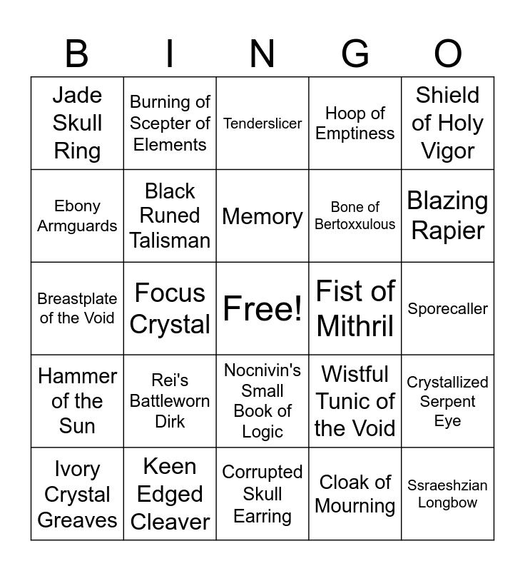 This bingo card has a free space and 108 words: Silver Lined Sleeves, Earring of Resistance, Focus Crystal, Bone Golem Vambraces, Serpent Skin Armlet, Scale Mesh Vambraces, Mana Twined Staff, Righteousness, Khashek's Katar, Scale Mesh Leggings, Shadowed Silk Pants, Bone Golem Greaves, Serpent Skin Leggins, Crystal of Interpretation, Gloves of Control, Talisman of Evasion, Burning of Scepter of Elements, Scimitar of Oak, Smouldershank, Sword of Nochular, Rei's Battleworn Dirk, Polished Bone Collar, Shield of Auras, Great Helm of True Vision, Sleeves of Elemental Auras, Shield of Holy Vigor, Ebony Armguards, Hoop of Emptiness, Pristine Jade Idol, Faded Skull Medallion, Blatinum Mesh Guard, Keen Edged Cleaver, Blindfore, Sword of Lost Crusades, Lava Infused Bludgeon, Tenderslicer, Savage Lord's Pitchatka, Rancorus SKull of Szaldrezh, Braided Strands of Corrupted Mana, Ssraeshzian Longbow, Windspeeder, Hammer of the Sun, Corrupted Skull Earring, Dusty Blue Shawl, Venomous Eyepatch, Black Runed Talisman, Tainted Scale Belt, Memory, Blasphemous Blade of the Exiled, Fist of Mithril, Elphorn's Cleaver, Blazing Rapier, Hammer of the Sun, Scepter of Paralysis, Band of Disrupted Auras, Gleaming Serpent Tooth Choker, Shround of Unholiness, Scorched Silver Pauldrons, Geomantic Focus, Jade Skull Ring, Bloodfrenzy, Goldenrod, Khalshazar, Fangs of Vyzh`dra, Claw of Vyzh`dra, Vyzh`dra's Render of Souls, Cloak of Dark Shadows, Crystallized Serpent Eye, Vengeful Mail of the Void, Wistful Tunic of the Void, Nocnivin's Small Book of Logic, Breastplate of the Void, Cloak of Mourning, Black Runed Pants, Opaline Charm, Circle of Smoke, Belt of Mystical Protection, Sapphire Studded Mantle, Shroud of Emerald Vines, Pearlescent Armlet, Supple Onyx Chains, Ivory Crystal Greaves, Halo of Enlightening Barriers, Shield of Ssraeshza, Earring of Dissention, Wrath's Edge, Bloodbath, Mindpuncture, Norge`tal, Blackout, Sporecaller, Bone of Bertoxxulous, Belt of Mystical Protection, Sapphire Studded Mantle, Shroud of Emerald Vines, Pearlescent Armlet, Supple Onyx Chains, Ivory Crystal Greaves, Halo of Enlightening Barriers, Shield of Ssraeshza, Earring of Dissention, Wrath's Edge, Bloodbath, Mindpuncture, Norge`tal, Blackout, Sporecaller and Bone of Bertoxxulous.