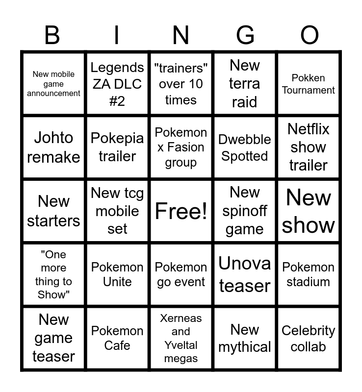 This bingo card has a free space and 24 words: Pokemon Unite, Pokemon Cafe, Pokemon x Fasion group, New game teaser, Pokken Tournament, New mobile game announcement, Johto remake, Legends ZA DLC #2, New spinoff game, Pokemon go event, Dwebble Spotted, New starters, Unova teaser, Pokemon stadium, Pokepia trailer, New mythical, New show, "trainers" over 10 times, Netflix show trailer, New tcg mobile set, Celebrity collab, "One more thing to Show", New terra raid and Xerneas and Yveltal megas.