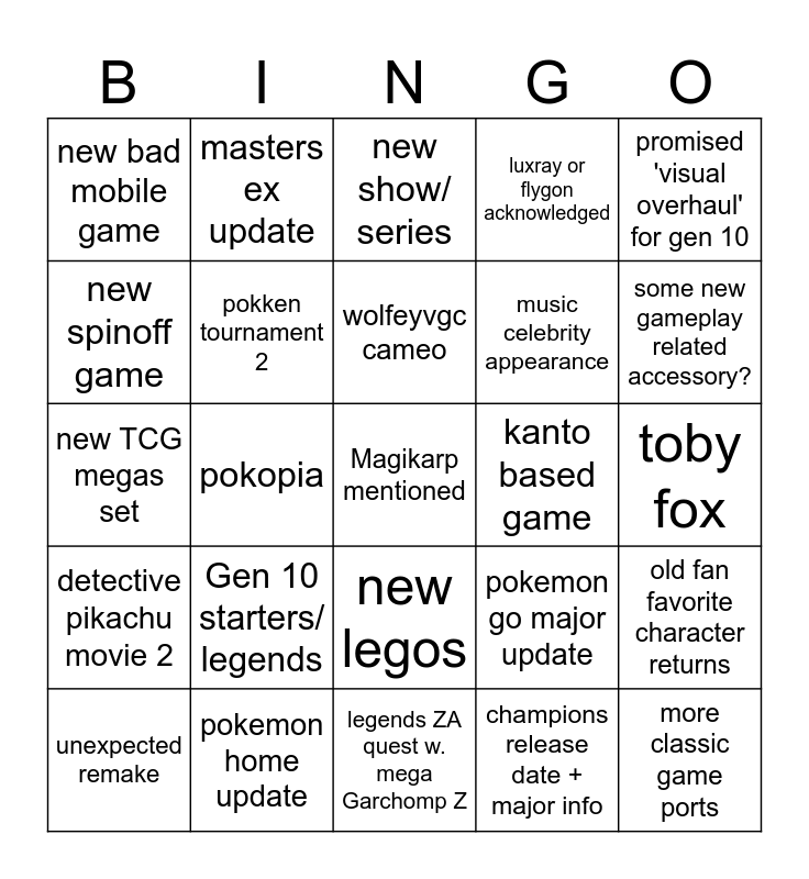 This bingo card has a free space and 24 words: Gen 10 starters/ legends, pokemon home update, wolfeyvgc cameo, unexpected remake, promised 'visual overhaul' for gen 10, new bad mobile game, new spinoff game, masters ex update, kanto based game, new legos, music celebrity appearance, new TCG megas set, pokemon go major update, old fan favorite character returns, pokken tournament 2, champions release date + major info, toby fox, new show/ series, some new gameplay related accessory?, pokopia, more classic game ports, detective pikachu movie 2, luxray or flygon acknowledged and legends ZA quest w. mega Garchomp Z.