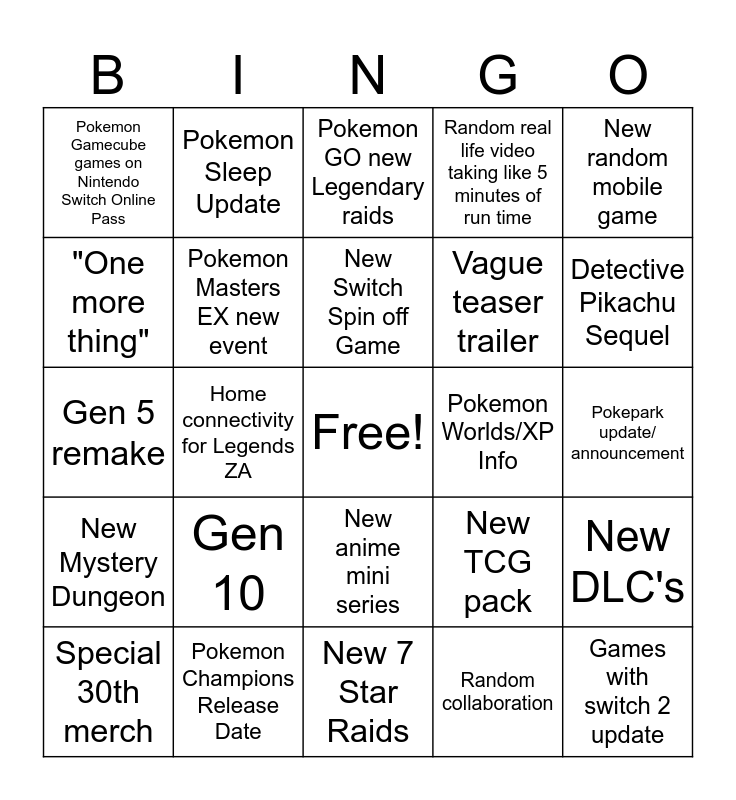 This bingo card has a free space and 24 words: Gen 10, Pokemon Champions Release Date, New Switch Spin off Game, Special 30th merch, New random mobile game, Pokemon Gamecube games on Nintendo Switch Online Pass, "One more thing", Pokemon Sleep Update, Pokemon Worlds/XP Info, New anime mini series, Vague teaser trailer, Gen 5 remake, New TCG pack, New DLC's, Pokemon Masters EX new event, Random collaboration, Pokepark update/ announcement, Pokemon GO new Legendary raids, Detective Pikachu Sequel, Home connectivity for Legends ZA, Games with switch 2 update, New Mystery Dungeon, Random real life video taking like 5 minutes of run time and New 7 Star Raids.
