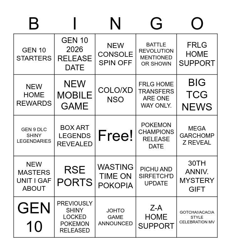 This bingo card has a free space and 24 words: GEN 10, RSE PORTS, COLO/XD NSO, Z-A HOME SUPPORT, FRLG HOME SUPPORT, GEN 10 STARTERS, GEN 10 2026 RELEASE DATE, NEW CONSOLE SPIN OFF, POKEMON CHAMPIONS RELEASE DATE, MEGA GARCHOMP Z REVEAL, GEN 9 DLC SHINY LEGENDARIES, NEW MOBILE GAME, PICHU AND SIRFETCH'D UPDATE, 30TH ANNIV. MYSTERY GIFT, NEW HOME REWARDS, PREVIOUSLY SHINY LOCKED POKEMON RELEASED, JOHTO GAME ANNOUNCED, BATTLE REVOLUTION MENTIONED OR SHOWN, BIG TCG NEWS, NEW MASTERS UNIT I GAF ABOUT, BOX ART LEGENDS REVEALED, WASTING TIME ON POKOPIA, FRLG HOME TRANSFERS ARE ONE WAY ONLY. and GOTCHA!/ACACIA STYLE CELEBRATION MV.