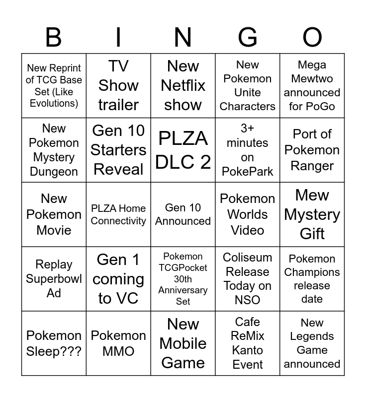 This bingo card has a free space and 24 words: Gen 1 coming to VC, Pokemon MMO, PLZA DLC 2, Pokemon Sleep???, Mega Mewtwo announced for PoGo, New Reprint of TCG Base Set (Like Evolutions), New Pokemon Mystery Dungeon, TV Show trailer, Pokemon Worlds Video, Pokemon TCGPocket 30th Anniversary Set, 3+ minutes on PokePark, New Pokemon Movie, Coliseum Release Today on NSO, Pokemon Champions release date, Gen 10 Starters Reveal, Cafe ReMix Kanto Event, Mew Mystery Gift, New Netflix show, Port of Pokemon Ranger, PLZA Home Connectivity, New Legends Game announced, Replay Superbowl Ad, New Pokemon Unite Characters and New Mobile Game.