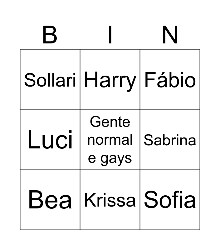 This bingo card has a free space and 8 words: Sabrina, Fábio, Harry, Bea, Sollari, Sofia, Luci and Krissa.