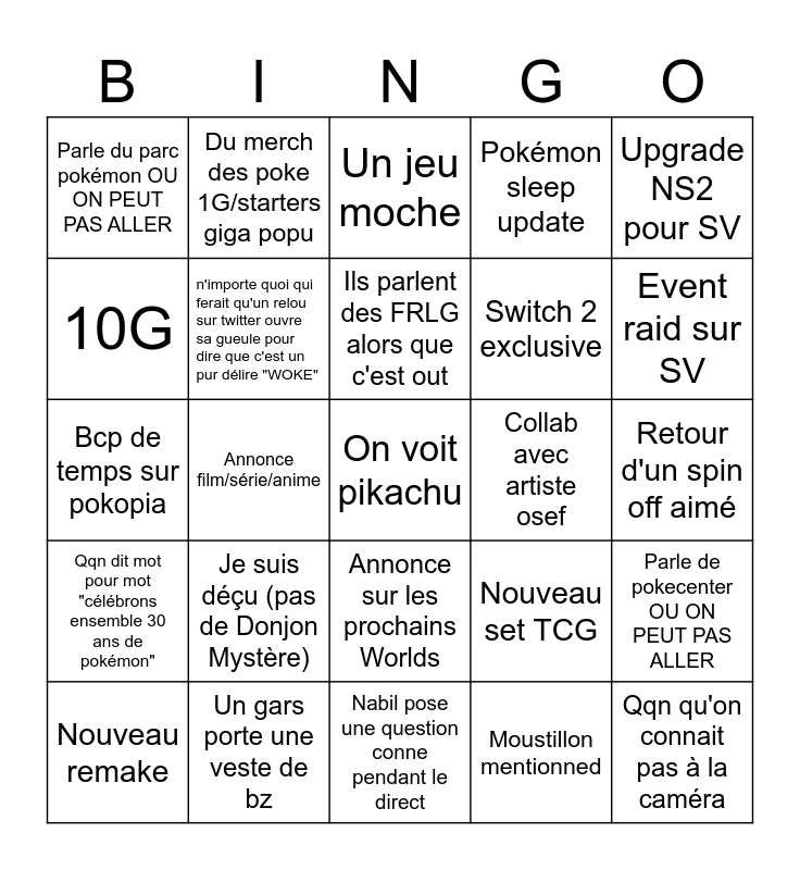 This bingo card has a free space and 24 words: Je suis déçu (pas de Donjon Mystère), Un gars porte une veste de bz, Ils parlent des FRLG alors que c'est out, Nouveau remake, Upgrade NS2 pour SV, Parle du parc pokémon OU ON PEUT PAS ALLER, 10G, Du merch des poke 1G/starters giga popu, Collab avec artiste osef, Annonce sur les prochains Worlds, Switch 2 exclusive, Bcp de temps sur pokopia, Nouveau set TCG, Parle de pokecenter OU ON PEUT PAS ALLER, n'importe quoi qui ferait qu'un relou sur twitter ouvre sa gueule pour dire que c'est un pur délire "WOKE", Moustillon mentionned, Retour d'un spin off aimé, Un jeu moche, Event raid sur SV, Annonce film/série/anime, Qqn qu'on connait pas à la caméra, Qqn dit mot pour mot "célébrons ensemble 30 ans de pokémon", Pokémon sleep update and Nabil pose une question conne pendant le direct.