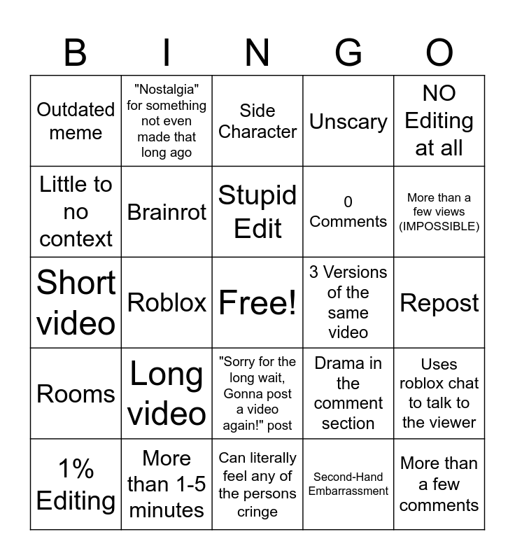 This bingo card has a free space and 34 words: Cornball, Second-Hand Embarrassment, Cosplay, Unfunny Joke, Rooms, Brainrot, NO Editing at all, 1% Editing, "Nostalgia" for something not even made that long ago, Obby Creator, Stupid Edit, Side Character, MORE Than 1 Side character, Horrible music, 3 Versions of the same video, More than a few views (IMPOSSIBLE), More than 1-5 minutes, Short video, Long video, Drama in the comment section, "Sorry for the long wait, Gonna post a video again!" post, Unnecessary post, Outdated meme, Repost, Can literally feel any of the persons cringe, More than a few comments, Unscary, Hard watch, 0 Comments, Little to no context, Dandy's world, Roblox, Uses roblox chat to talk to the viewer and Obvious signs i was young making this.