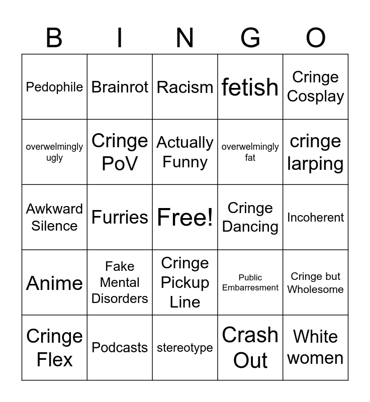 This bingo card has a free space and 32 words: Crash Out, Edits / Filters, Furries, Alpha / Sigma, Anime, Cringe PoV, Cringe Cosplay, Cringe but Wholesome, Brainrot, Politics, Actually Funny, Racism, Sexism, Cringe Signing Attempt, Cringe Dancing, Lip Sync, Cringe Flex, Awkward Silence, Cringe Pickup Line, Fake Mental Disorders, Public Embarresment, Sound Effects, Incoherent, Podcasts, White women, fetish, overwelmingly fat, overwelmingly ugly, Pedophile, stereotype, women... and cringe larping.