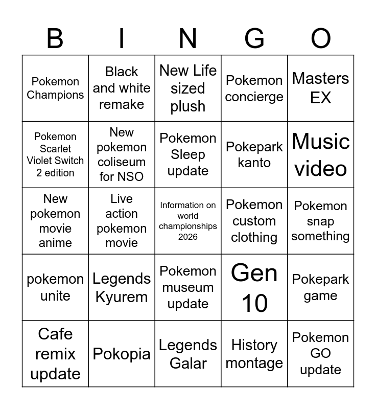 This bingo card has 25 words: Legends Kyurem, Legends Galar, Pokemon Sleep update, Cafe remix update, Masters EX, Pokemon Champions, Pokemon Scarlet Violet Switch 2 edition, Black and white remake, Pokemon custom clothing, Pokemon museum update, Pokepark kanto, New pokemon movie anime, Gen 10, Pokepark game, New pokemon coliseum for NSO, Pokemon GO update, Pokemon snap something, New Life sized plush, Music video, Live action pokemon movie, Information on world championships 2026, Pokopia, pokemon unite, Pokemon concierge and History montage.