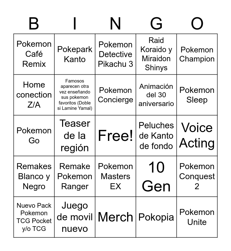 This bingo card has a free space and 24 words: Remake Pokemon Ranger, Juego de movil nuevo, Pokemon Concierge, Nuevo Pack Pokemon TCG Pocket y/o TCG, Pokemon Champion, Pokemon Café Remix, Home conection Z/A, Pokepark Kanto, Peluches de Kanto de fondo, Pokemon Masters EX, Animación del 30 aniversario, Pokemon Go, 10 Gen, Pokemon Conquest 2, Famosos aparecen otra vez enseñando sus pokemon favoritos (Doble si Lamine Yamal), Pokopia, Voice Acting, Pokemon Detective Pikachu 3, Pokemon Sleep, Teaser de la región, Pokemon Unite, Remakes Blanco y Negro, Raid Koraido y Miraidon Shinys and Merch.