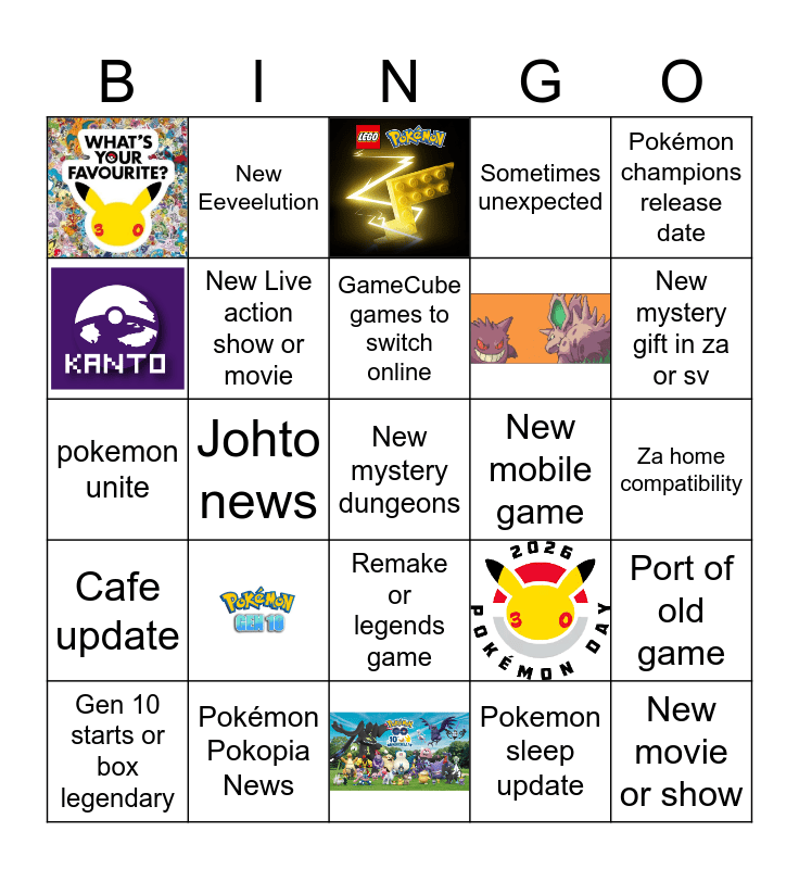 This bingo card has 7 images and 18 words: GameCube games to switch online, Gen 10 starts or box legendary, Pokémon champions release date, New Eeveelution, New mobile game, Remake or legends game, pokemon unite, Port of old game, New Live action show or movie, New movie or show, Za home compatibility, New mystery gift in za or sv, Johto news, New mystery dungeons, Pokémon Pokopia News, Cafe update, Sometimes unexpected and Pokemon sleep update.