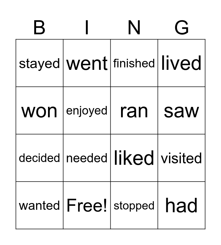 This bingo card has 27 words: changed, danced, decided, did, enjoyed, finished, went, had, Free!, helped, liked, lived, lost, loved, needed, played, ran, saw, started, stayed, stopped, studied, visited, wanted, watched, won and worked.