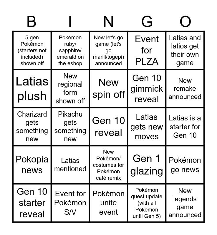 This bingo card has a free space and 24 words: Latias mentioned, Event for Pokémon S/V, New spin off, Gen 10 starter reveal, Latias and latios get their own game, 5 gen Pokémon (starters not included) shown off, Latias plush, Pokémon ruby/ sapphire/ emerald on the eshop, Latias gets new moves, New Pokémon/ costumes for Pokémon café remix, Gen 10 gimmick reveal, Charizard gets something new, Gen 1 glazing, Pokémon go news, New regional form shown off, Pokémon quest update (with all Pokémon until Gen 5), Latias is a starter for Gen 10, New let's go game (let's go marill/togepi) announced, New remake announced, Pikachu gets something new, New legends game announced, Pokopia news, Event for PLZA and Pokémon unite event.