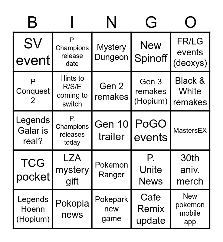 This bingo card has a free space and 24 words: LZA mystery gift, Pokopia news, Gen 2 remakes, Legends Hoenn (Hopium), FR/LG events (deoxys), SV event, P Conquest 2, P. Champions release date, PoGO events, Pokemon Ranger, Gen 3 remakes (Hopium), Legends Galar is real?, P. Unite News, 30th aniv. merch, Hints to R/S/E coming to switch, Cafe Remix update, MastersEX, Mystery Dungeon, Black & White remakes, P. Champions releases today, New pokemon mobile app, TCG pocket, New Spinoff and Pokepark new game.