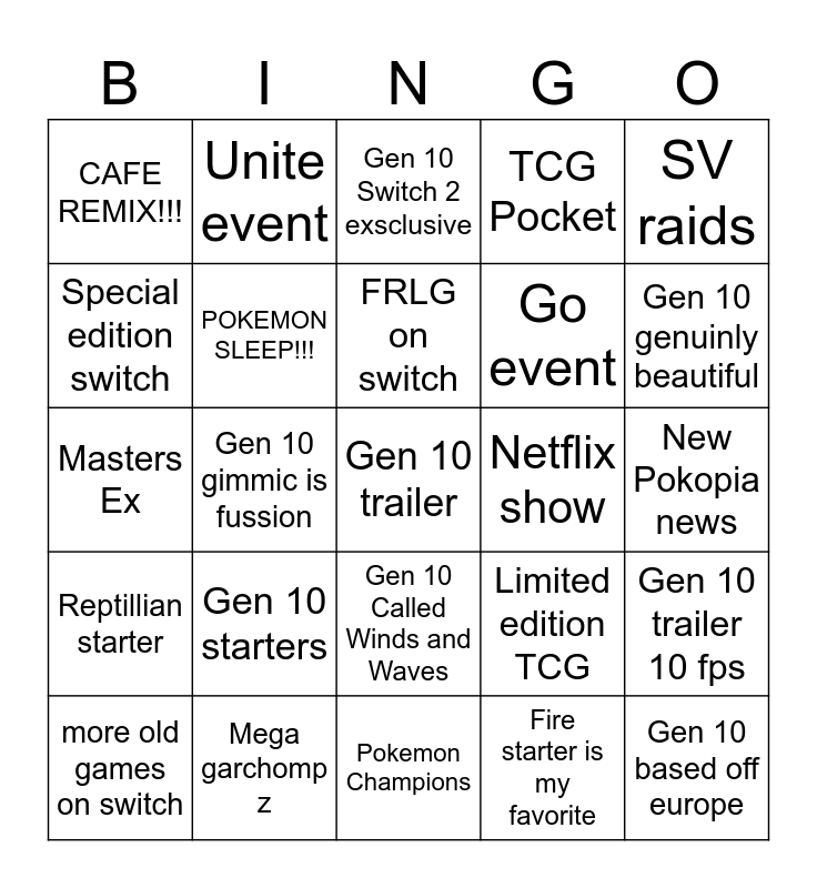 This bingo card has a free space and 24 words: Gen 10 starters, Mega garchomp z, FRLG on switch, more old games on switch, SV raids, CAFE REMIX!!!, Special edition switch, Unite event, Netflix show, Gen 10 Called Winds and Waves, Go event, Masters Ex, Limited edition TCG, Gen 10 trailer 10 fps, POKEMON SLEEP!!!, Fire starter is my favorite, New Pokopia news, Gen 10 Switch 2 exsclusive, Gen 10 genuinly beautiful, Gen 10 gimmic is fussion, Gen 10 based off europe, Reptillian starter, TCG Pocket and Pokemon Champions.