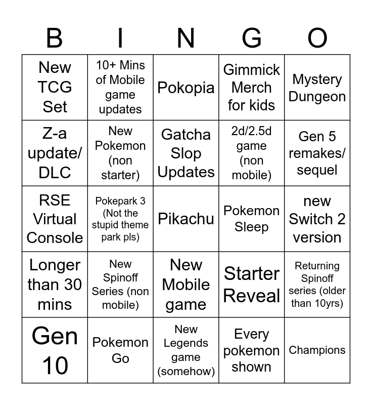 This bingo card has a free space and 24 words: New Spinoff Series (non mobile), Pokemon Go, Gatcha Slop Updates, Gen 10, Mystery Dungeon, New TCG Set, Z-a update/ DLC, 10+ Mins of Mobile game updates, Pokemon Sleep, New Mobile game, 2d/2.5d game (non mobile), RSE Virtual Console, Starter Reveal, Returning Spinoff series (older than 10yrs), New Pokemon (non starter), Every pokemon shown, new Switch 2 version, Pokopia, Gen 5 remakes/ sequel, Pokepark 3 (Not the stupid theme park pls), Champions, Longer than 30 mins, Gimmick Merch for kids and New Legends game (somehow).