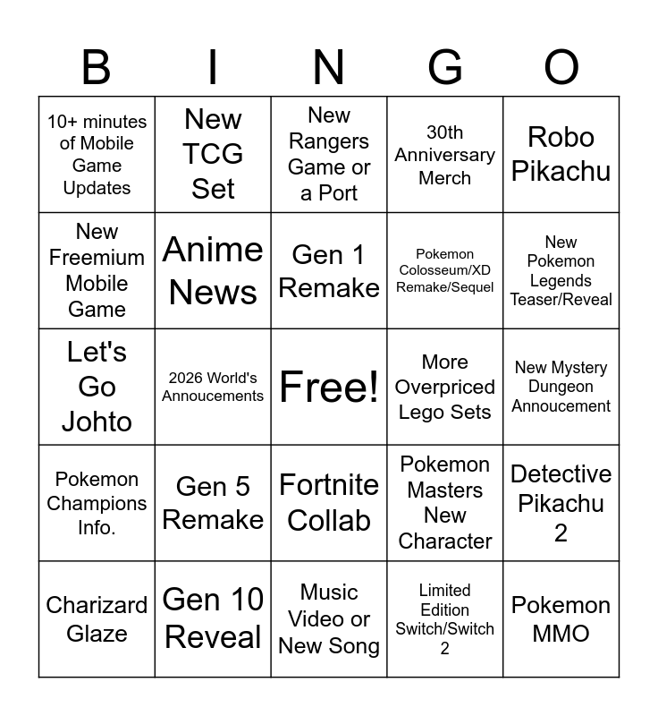This bingo card has a free space and 24 words: Gen 5 Remake, Gen 10 Reveal, Gen 1 Remake, Charizard Glaze, Robo Pikachu, 10+ minutes of Mobile Game Updates, New Freemium Mobile Game, New TCG Set, More Overpriced Lego Sets, Fortnite Collab, Pokemon Colosseum/XD Remake/Sequel, Let's Go Johto, Pokemon Masters New Character, Detective Pikachu 2, Anime News, Limited Edition Switch/Switch 2, New Mystery Dungeon Annoucement, New Rangers Game or a Port, New Pokemon Legends Teaser/Reveal, 2026 World's Annoucements, Pokemon MMO, Pokemon Champions Info., 30th Anniversary Merch and Music Video or New Song.