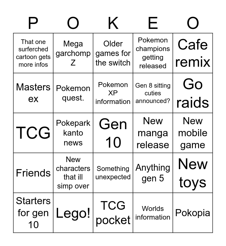 This bingo card has a free space and 24 words: New characters that ill simp over, Lego!, Pokemon XP information, Starters for gen 10, Cafe remix, That one surferched cartoon gets more infos, Masters ex, Mega garchomp Z, New manga release, Something unexpected, Gen 8 sitting cuties announced?, TCG, Anything gen 5, New toys, Pokemon quest., Worlds information, New mobile game, Older games for the switch, Go raids, Pokepark kanto news, Pokopia, Friends, Pokemon champions getting released and TCG pocket.