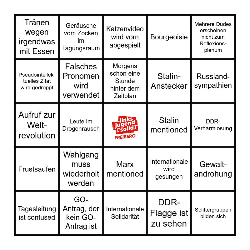 This bingo card has a free space and 24 words: Wahlgang muss wiederholt werden, GO-Antrag, der kein GO-Antrag ist, Morgens schon eine Stunde hinter dem Zeitplan, Tagesleitung ist confused, Mehrere Dudes erscheinen nicht zum Reflexions-plenum, Tränen wegen irgendwas mit Essen, Pseudointellek-tuelles Zitat wird gedroppt, Geräusche vom Zocken im Tagungsraum, Stalin mentioned, Marx mentioned, Stalin-Anstecker, Aufruf zur Welt-revolution, Internationale wird gesungen, Gewalt-androhung, Falsches Pronomen wird verwendet, DDR-Flagge ist zu sehen, DDR-Verharmlosung, Katzenvideo wird vorn abgespielt, Russland-sympathien, Leute im Drogenrausch, Splittergruppen bilden sich, Frustsaufen, Bourgeoisie and Internationale Solidarität.
