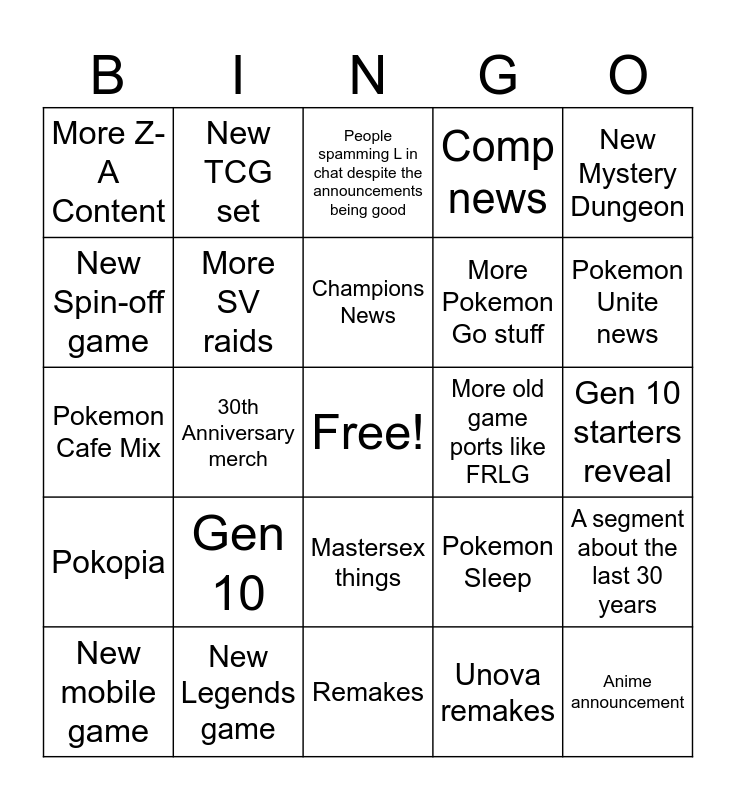 This bingo card has a free space and 24 words: Gen 10, New Legends game, Champions News, New mobile game, New Mystery Dungeon, More Z-A Content, New Spin-off game, New TCG set, More old game ports like FRLG, Mastersex things, More Pokemon Go stuff, Pokemon Cafe Mix, Pokemon Sleep, A segment about the last 30 years, More SV raids, Unova remakes, Gen 10 starters reveal, People spamming L in chat despite the announcements being good, Pokemon Unite news, 30th Anniversary merch, Anime announcement, Pokopia, Comp news and Remakes.