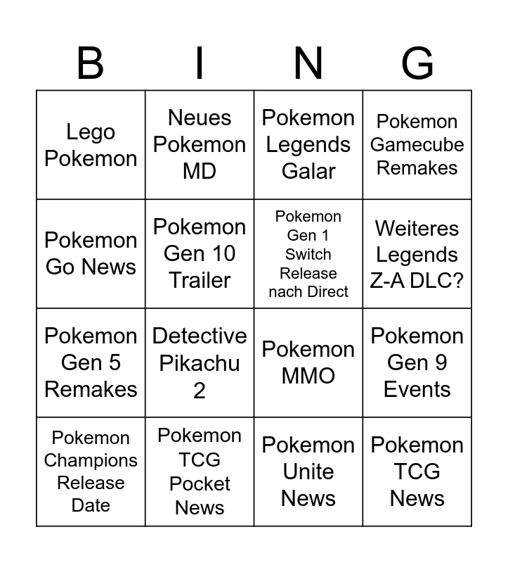 This bingo card has 16 words: Pokemon TCG Pocket News, Pokemon Gen 9 Events, Pokemon Legends Galar, Lego Pokemon, Pokemon Gen 5 Remakes, Neues Pokemon MD, Pokemon MMO, Pokemon Unite News, Pokemon Go News, Pokemon Gen 10 Trailer, Pokemon Champions Release Date, Pokemon Gamecube Remakes, Detective Pikachu 2, Weiteres Legends Z-A DLC?, Pokemon Gen 1 Switch Release nach Direct and Pokemon TCG News.