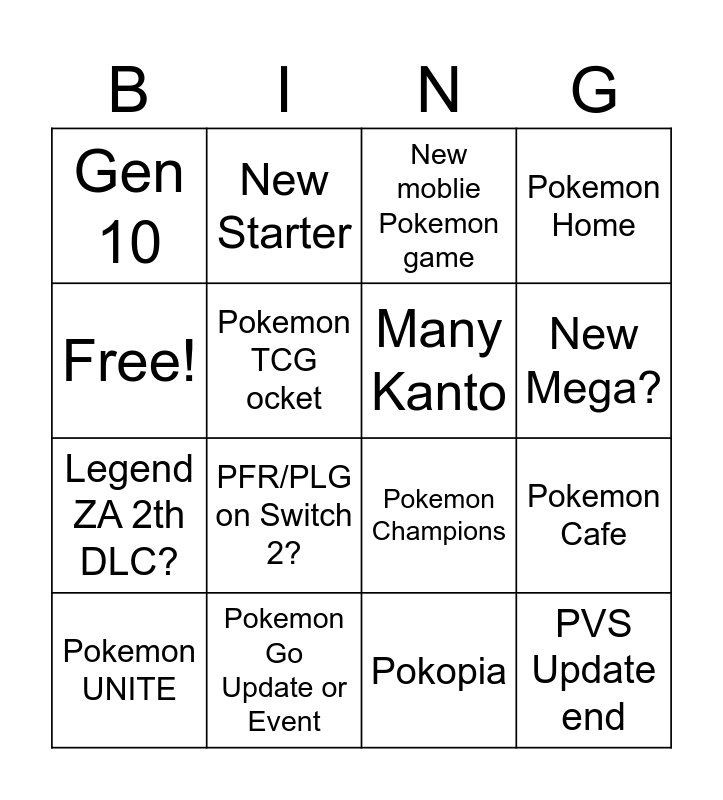 This bingo card has 16 words: Pokemon Go Update or Event, Pokemon Cafe, New moblie Pokemon game, Gen 10, Legend ZA 2th DLC?, New Starter, Pokemon Champions, Pokopia, Free!, Pokemon TCG ocket, Pokemon UNITE, Pokemon Home, PFR/PLG on Switch 2?, New Mega?, Many Kanto and PVS Update end.