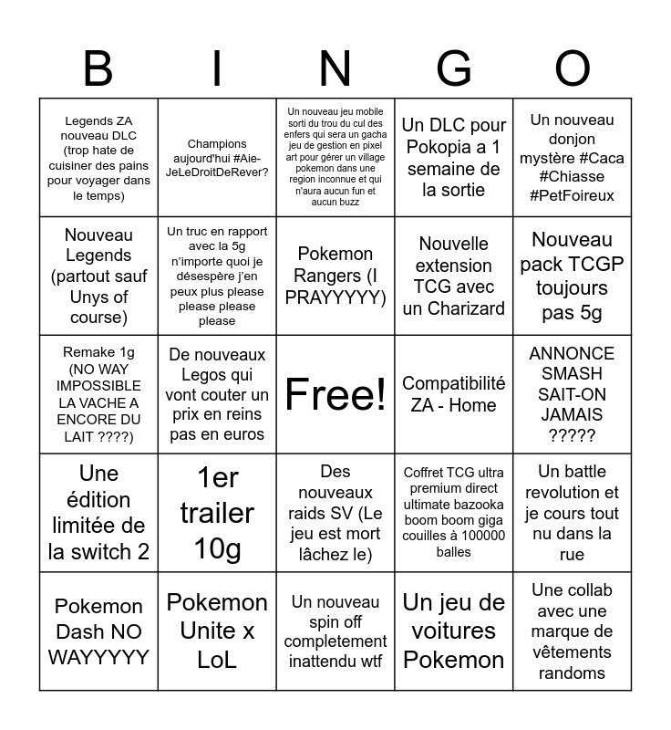 This bingo card has a free space and 24 words: 1er trailer 10g, Pokemon Unite x LoL, Pokemon Rangers (I PRAYYYYY), Pokemon Dash NO WAYYYYY, Un nouveau donjon mystère #Caca #Chiasse #PetFoireux, Legends ZA nouveau DLC (trop hate de cuisiner des pains pour voyager dans le temps), Nouveau Legends (partout sauf Unys of course), Champions aujourd'hui #Aie-JeLeDroitDeRever?, Compatibilité ZA - Home, Des nouveaux raids SV (Le jeu est mort lâchez le), Nouvelle extension TCG avec un Charizard, Remake 1g (NO WAY IMPOSSIBLE LA VACHE A ENCORE DU LAIT ????), Coffret TCG ultra premium direct ultimate bazooka boom boom giga couilles à 100000 balles, Un battle revolution et je cours tout nu dans la rue, Un truc en rapport avec la 5g n’importe quoi je désespère j’en peux plus please please please please, Un jeu de voitures Pokemon, ANNONCE SMASH SAIT-ON JAMAIS ?????, Un nouveau jeu mobile sorti du trou du cul des enfers qui sera un gacha jeu de gestion en pixel art pour gérer un village pokemon dans une region inconnue et qui n'aura aucun fun et aucun buzz, Nouveau pack TCGP toujours pas 5g, De nouveaux Legos qui vont couter un prix en reins pas en euros, Une collab avec une marque de vêtements randoms, Une édition limitée de la switch 2, Un DLC pour Pokopia a 1 semaine de la sortie and Un nouveau spin off completement inattendu wtf.