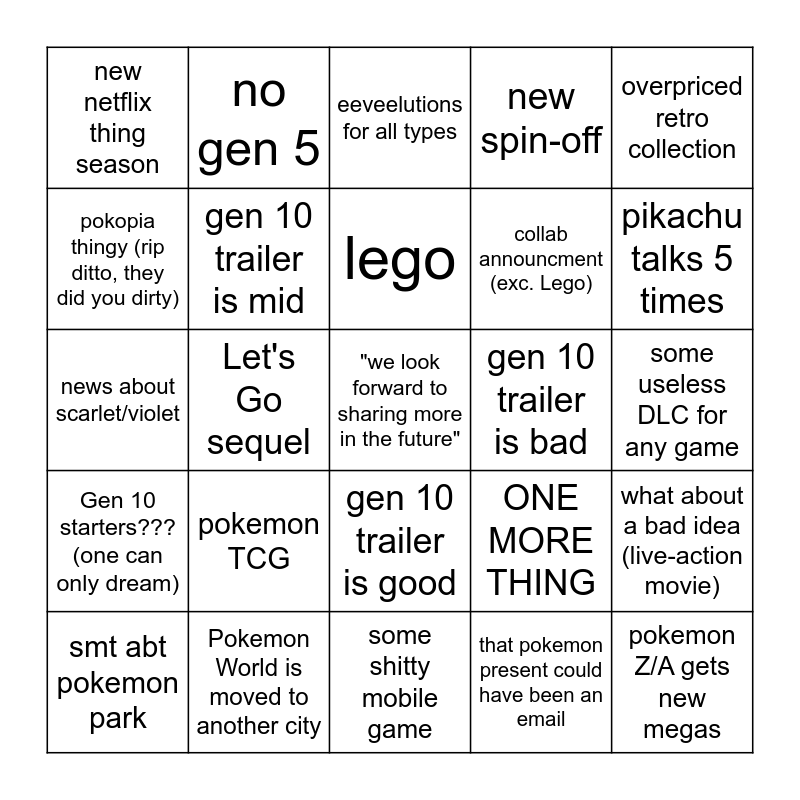 This bingo card has 25 words: pokemon TCG, some shitty mobile game, lego, smt abt pokemon park, overpriced retro collection, new netflix thing season, pokopia thingy (rip ditto, they did you dirty), no gen 5, gen 10 trailer is bad, gen 10 trailer is good, collab announcment (exc. Lego), news about scarlet/violet, ONE MORE THING, what about a bad idea (live-action movie), gen 10 trailer is mid, pokemon Z/A gets new megas, some useless DLC for any game, eeveelutions for all types, pikachu talks 5 times, Let's Go sequel, "we look forward to sharing more in the future", Pokemon World is moved to another city, Gen 10 starters??? (one can only dream), new spin-off and that pokemon present could have been an email.
