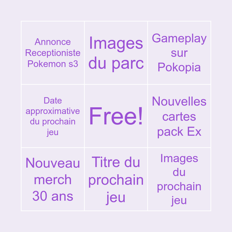 This bingo card has a free space and 8 words: Nouvelles cartes pack Ex, Gameplay sur Pokopia, Images du parc, Nouveau merch 30 ans, Annonce Receptioniste Pokemon s3, Images du prochain jeu, Date approximative du prochain jeu and Titre du prochain jeu.