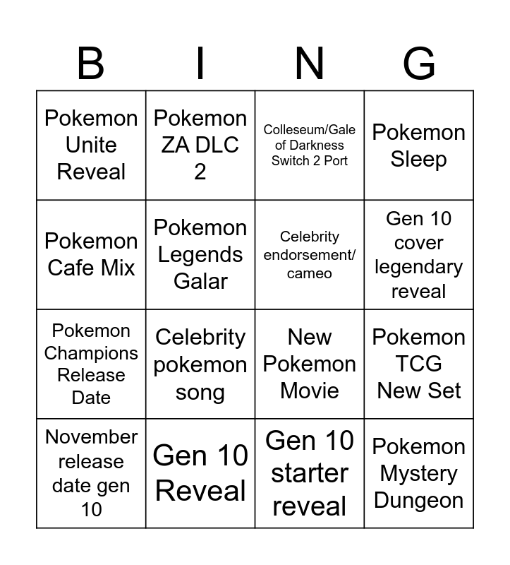 This bingo card has 16 words: Gen 10 Reveal, Pokemon TCG New Set, Colleseum/Gale of Darkness Switch 2 Port, Pokemon Unite Reveal, Pokemon Champions Release Date, Pokemon ZA DLC 2, New Pokemon Movie, Gen 10 starter reveal, Pokemon Cafe Mix, Pokemon Legends Galar, November release date gen 10, Pokemon Sleep, Celebrity pokemon song, Gen 10 cover legendary reveal, Celebrity endorsement/ cameo and Pokemon Mystery Dungeon.