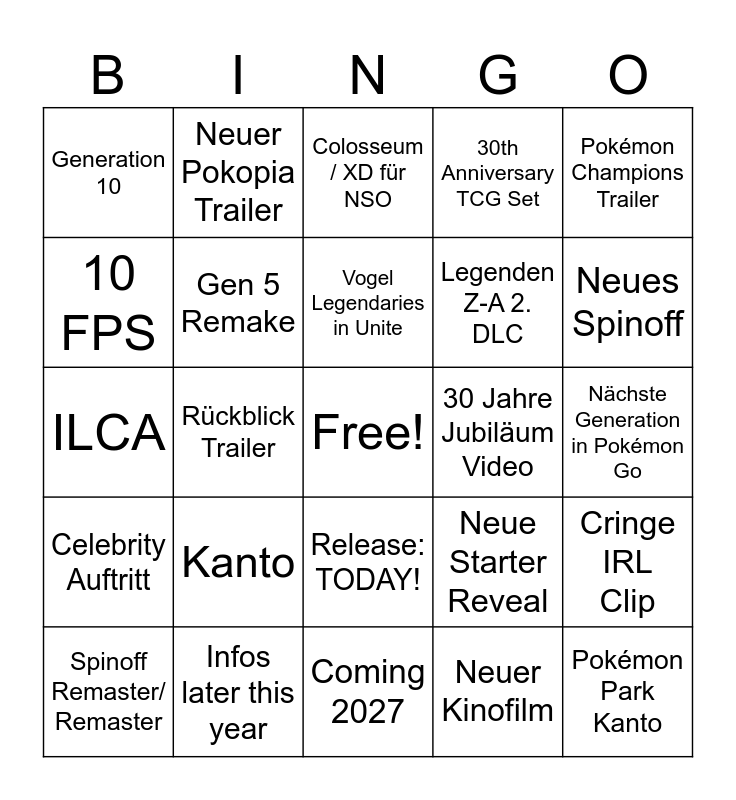 This bingo card has a free space and 24 words: Kanto, Infos later this year, Vogel Legendaries in Unite, Spinoff Remaster/ Remaster, Pokémon Champions Trailer, Generation 10, 10 FPS, Neuer Pokopia Trailer, 30 Jahre Jubiläum Video, Release: TODAY!, Legenden Z-A 2. DLC, ILCA, Neue Starter Reveal, Cringe IRL Clip, Gen 5 Remake, Neuer Kinofilm, Nächste Generation in Pokémon Go, Colosseum / XD für NSO, Neues Spinoff, Rückblick Trailer, Pokémon Park Kanto, Celebrity Auftritt, 30th Anniversary TCG Set and Coming 2027.