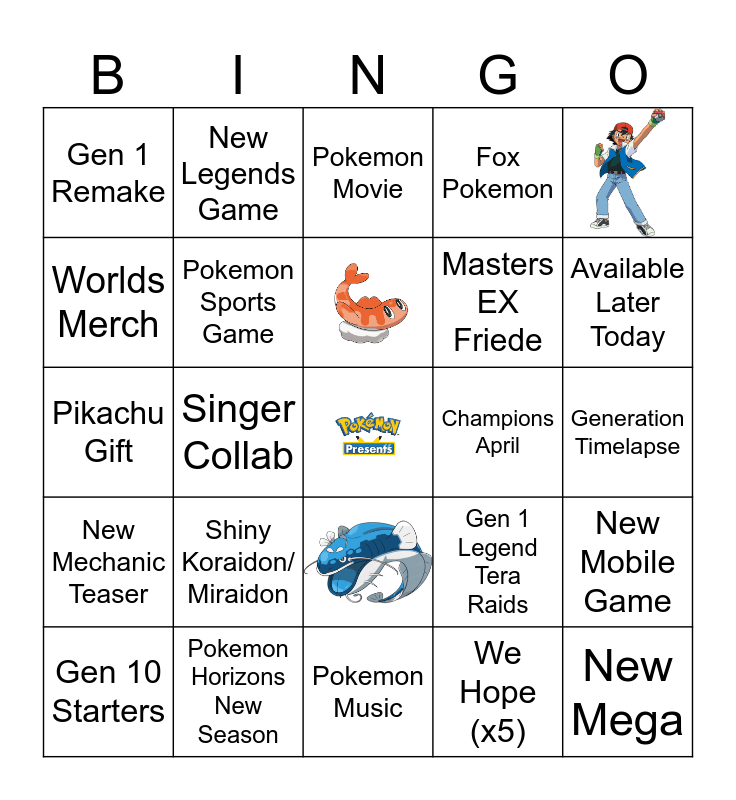 This bingo card has 3 images, a free space and 21 words: Shiny Koraidon/ Miraidon, Pokemon Horizons New Season, Gen 10 Starters, Gen 1 Remake, Worlds Merch, New Legends Game, Champions April, Masters EX Friede, Pikachu Gift, Gen 1 Legend Tera Raids, New Mobile Game, Pokemon Sports Game, We Hope (x5), Generation Timelapse, Pokemon Movie, Available Later Today, Singer Collab, New Mega, New Mechanic Teaser, Fox Pokemon and Pokemon Music.