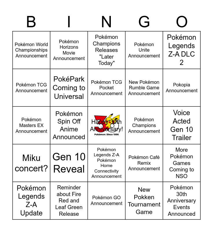 This bingo card has a free space and 24 words: Gen 10 Reveal, Reminder about Fire Red and Leaf Green Release, Pokémon TCG Pocket Announcement, Pokémon Legends Z-A Update, Pokémon Legends Z-A DLC 2, Pokémon World Championships Announcement, Pokémon TCG Announcement, Pokémon Horizons Movie Announcement, Pokémon Champions Announcement, Pokémon Legends Z-A Pokémon Home Connectivity Announcement, New Pokémon Rumble Game Announcement, Pokémon Masters EX Announcement, Pokémon Café Remix Announcement, More Pokémon Games Coming to NSO, PokéPark Coming to Universal, New Pokken Tournament Game, Voice Acted Gen 10 Trailer, Pokémon Champions Releases "Later Today", Pokopia Announcement, Pokémon Spin Off Anime Announced, Pokémon 30th Anniversary Events Announced, Miku concert?, Pokémon Unite Announcement and Pokémon GO Announcement.