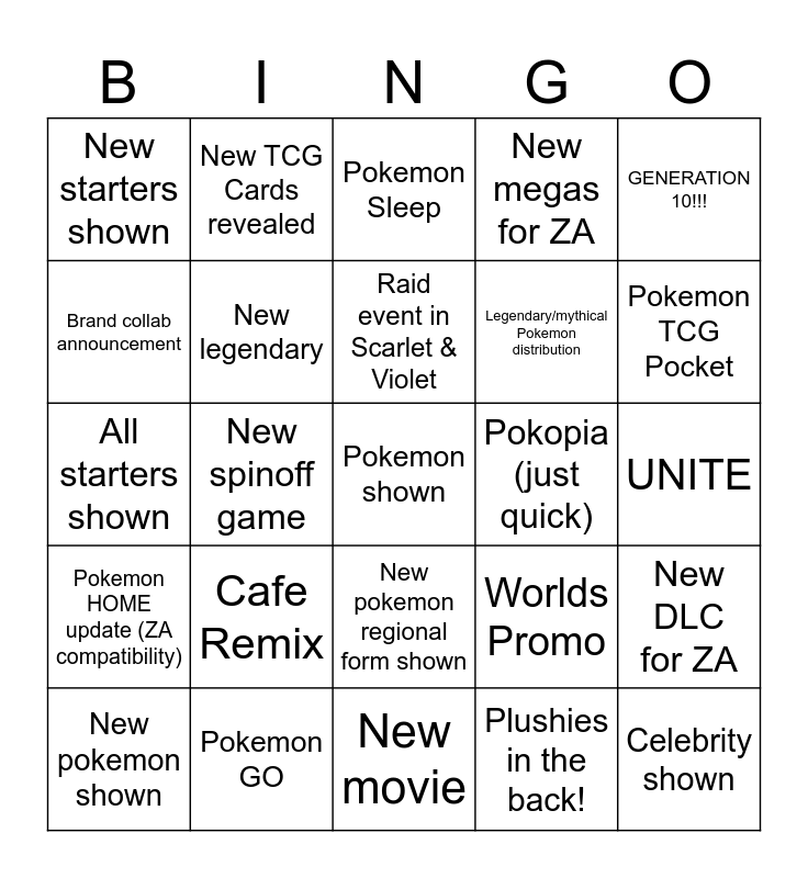This bingo card has a free space and 24 words: Cafe Remix, Pokemon GO, Raid event in Scarlet & Violet, New pokemon shown, GENERATION 10!!!, New starters shown, Brand collab announcement, New TCG Cards revealed, Pokopia (just quick), New pokemon regional form shown, Legendary/mythical Pokemon distribution, All starters shown, Worlds Promo, New DLC for ZA, New legendary, Plushies in the back!, UNITE, Pokemon Sleep, Pokemon TCG Pocket, New spinoff game, Celebrity shown, Pokemon HOME update (ZA compatibility), New megas for ZA and New movie.