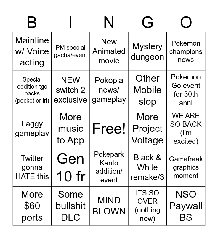 This bingo card has a free space and 24 words: Gen 10 fr, Some bullshit DLC, Pokopia news/ gameplay, More $60 ports, Pokemon champions news, Mainline w/ Voice acting, Special eddition tgc packs (pocket or irl), PM special gacha/event, More Project Voltage, Pokepark Kanto addition/ event, Other Mobile slop, Laggy gameplay, Black & White remake/3, Gamefreak graphics moment, NEW switch 2 exclusive, ITS SO OVER (nothing new), WE ARE SO BACK (I'm excited), New Animated movie, Pokemon Go event for 30th anni, More music to App, NSO Paywall BS, Twitter gonna HATE this, Mystery dungeon and MIND BLOWN.