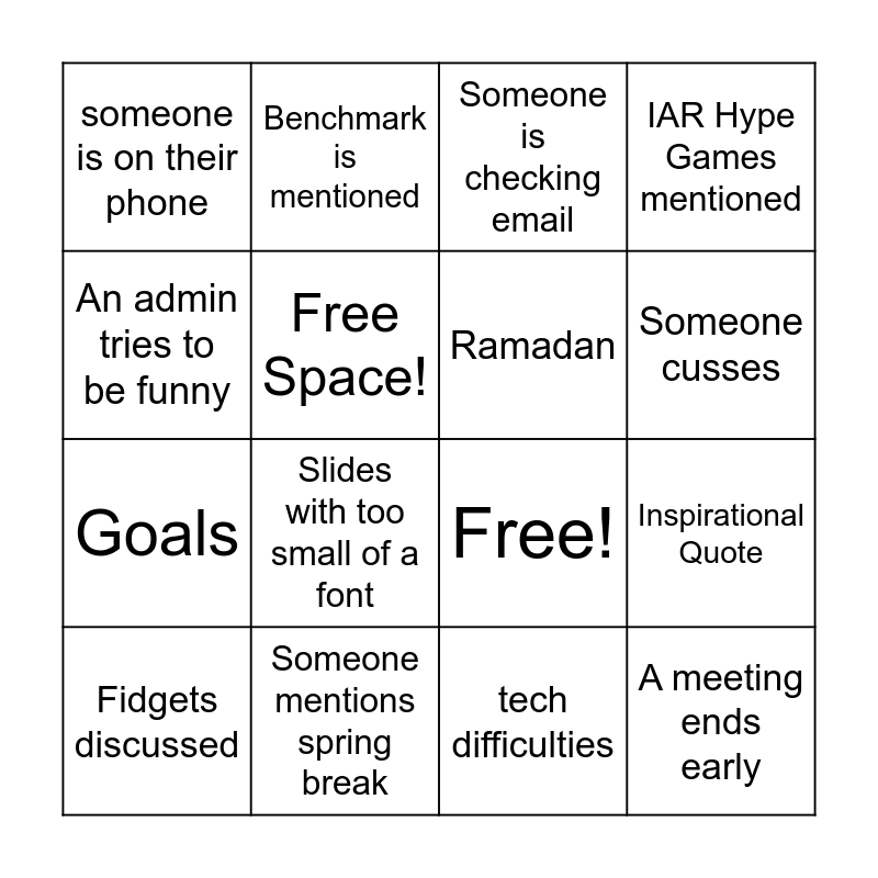 This bingo card has 19 words: Free!, DATA, Someone is checking email, A meeting ends early, Inspirational Quote, An admin tries to be funny, tech difficulties, someone is on their phone, Benchmark is mentioned, Goals, Slides with too small of a font, Free Space!, Ramadan, Someone mentions spring break, Fidgets discussed, Someone asks a question that only pertains to them, IAR Hype Games mentioned, Someone cusses and You see a teacher you don't recognize.
