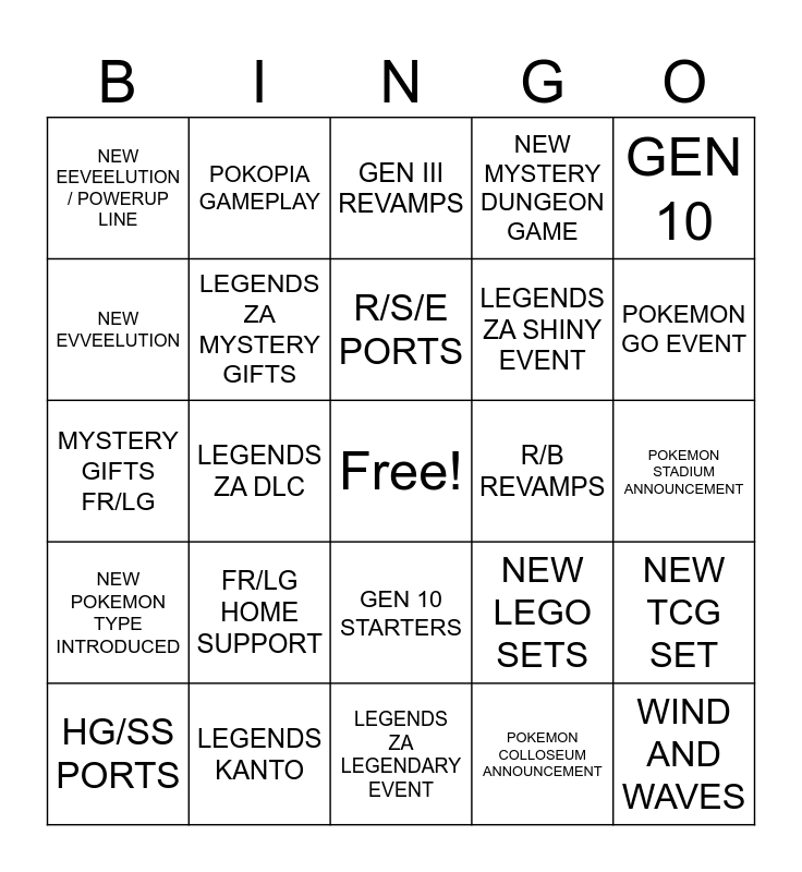 This bingo card has a free space and 24 words: FR/LG HOME SUPPORT, LEGENDS KANTO, R/S/E PORTS, HG/SS PORTS, GEN 10, NEW EEVEELUTION / POWERUP LINE, NEW EVVEELUTION, POKOPIA GAMEPLAY, R/B REVAMPS, GEN 10 STARTERS, LEGENDS ZA SHINY EVENT, MYSTERY GIFTS FR/LG, NEW LEGO SETS, NEW TCG SET, LEGENDS ZA MYSTERY GIFTS, POKEMON COLLOSEUM ANNOUNCEMENT, POKEMON STADIUM ANNOUNCEMENT, GEN III REVAMPS, POKEMON GO EVENT, LEGENDS ZA DLC, WIND AND WAVES, NEW POKEMON TYPE INTRODUCED, NEW MYSTERY DUNGEON GAME and LEGENDS ZA LEGENDARY EVENT.