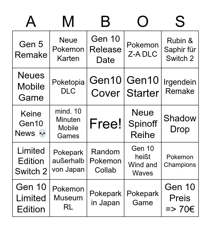 This bingo card has a free space and 24 words: Pokepark außerhalb von Japan, Pokemon Museum RL, Gen10 Cover, Gen 10 Limited Edition, Rubin & Saphir für Switch 2, Gen 5 Remake, Neues Mobile Game, Neue Pokemon Karten, Neue Spinoff Reihe, Random Pokemon Collab, Gen10 Starter, Keine Gen10 News 💀, Gen 10 heißt Wind and Waves, Pokemon Champions, Poketopia DLC, Pokepark Game, Shadow Drop, Gen 10 Release Date, Irgendein Remake, mind. 10 Minuten Mobile Games, Gen 10 Preis => 70€, Limited Edition Switch 2, Pokemon Z-A DLC and Pokepark in Japan.
