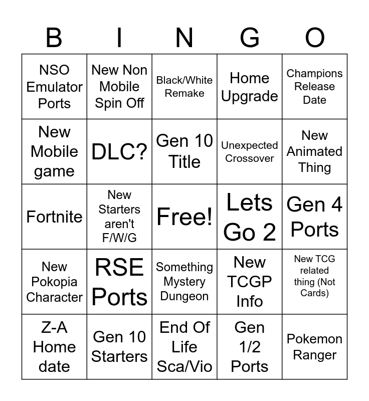 This bingo card has a free space and 24 words: RSE Ports, Gen 10 Starters, Gen 10 Title, Z-A Home date, Champions Release Date, NSO Emulator Ports, New Mobile game, New Non Mobile Spin Off, Lets Go 2, Something Mystery Dungeon, Unexpected Crossover, Fortnite, New TCGP Info, New TCG related thing (Not Cards), DLC?, Gen 1/2 Ports, Gen 4 Ports, Black/White Remake, New Animated Thing, New Starters aren't F/W/G, Pokemon Ranger, New Pokopia Character, Home Upgrade and End Of Life Sca/Vio.