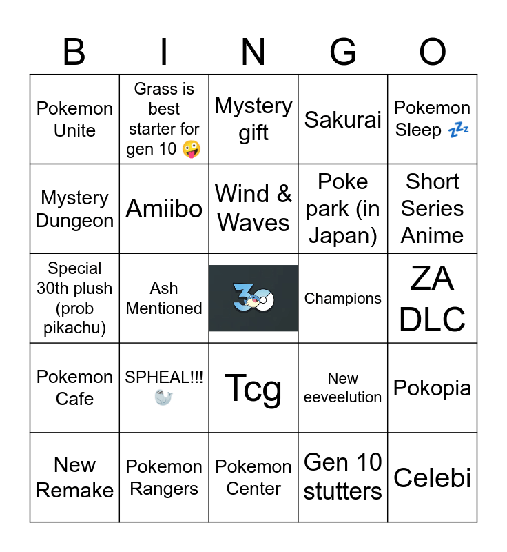 This bingo card has a free space and 24 words: SPHEAL!!! ðŸ¦, Pokemon Rangers, Wind & Waves, New Remake, Pokemon Sleep 💤, Pokemon Unite, Mystery Dungeon, Grass is best starter for gen 10 🤪, Champions, Tcg, Poke park (in Japan), Special 30th plush (prob pikachu), New eeveelution, Pokopia, Amiibo, Gen 10 stutters, ZA DLC, Mystery gift, Short Series Anime, Ash Mentioned, Celebi, Pokemon Cafe, Sakurai and Pokemon Center.
